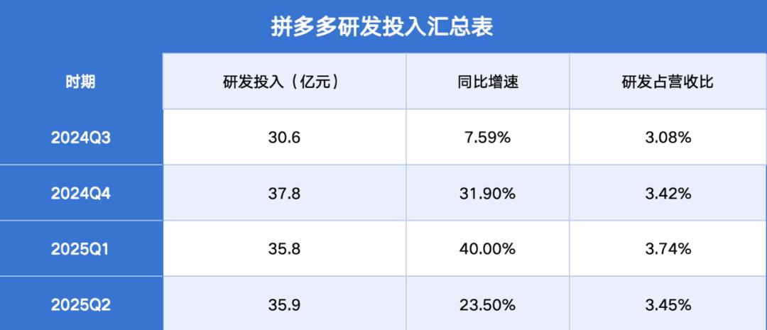 值得注意的是,尽管研发金额快速增长,但其研发占营收比重,始终控制在3%-4%区间,例如2025年一季度为3.74%,二季度为3.45%,体现了拼多多一贯强调效率与结果导向的技术投入思路。